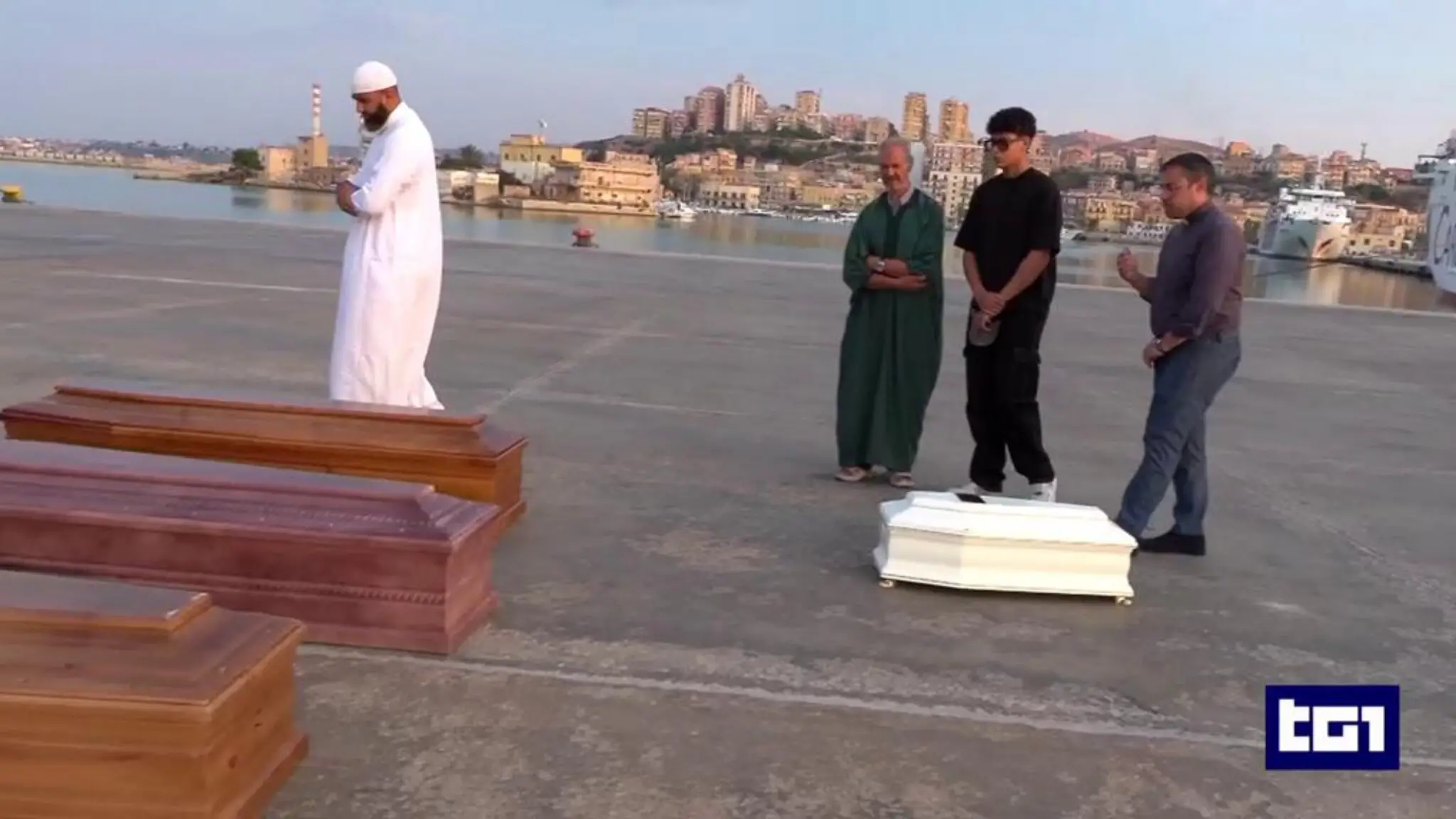 A Porto Empedocle un sacerdote e un imam pregano sui primi dieci feretri. Tra loro quelli di una bambina e del suo papà: la madre, sopravvissuta, ha chiesto di essere trasferita dove la figlia e il marito saranno sepolti