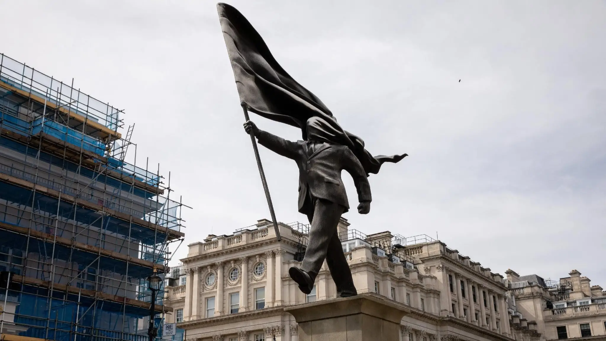 A Waterloo Place, nel centro di Londra, la statua di un uomo che cammina con una bandiera che gli copre il volto: la paternità è stata confermata da Banksy su Instagram