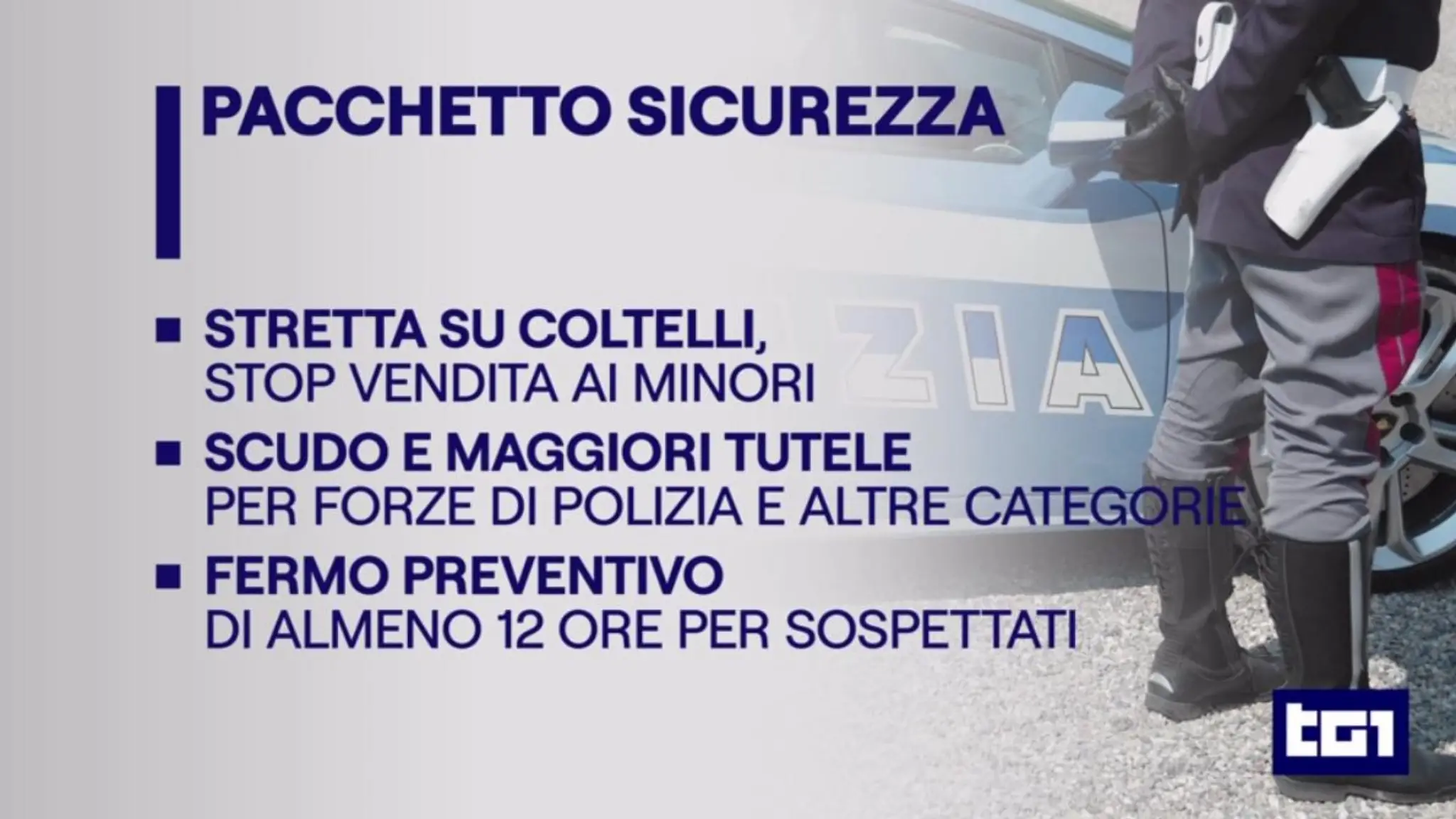 Composto da un decreto e da un disegno di legge. Entrano norme sui coltelli: stop vendita ai minori e divieto di avere con sé una lama superiore ai 5 cm. Scudo penale per forze di polizia e altre categorie. Fermo preventivo di 12 ore per i sospettati