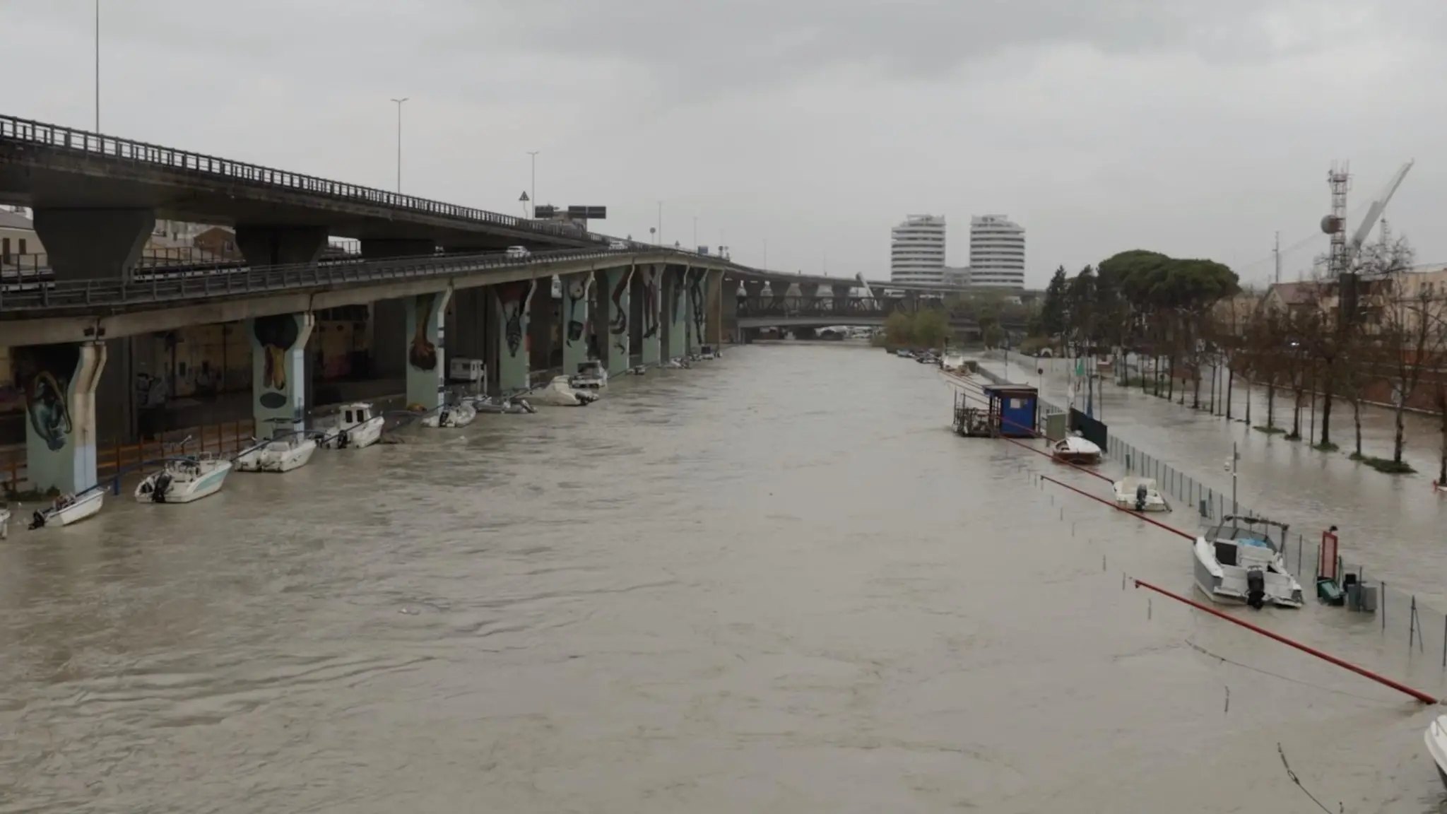 Pescara, il fiume che attraversa la città tracima e allaga le aree circostanti