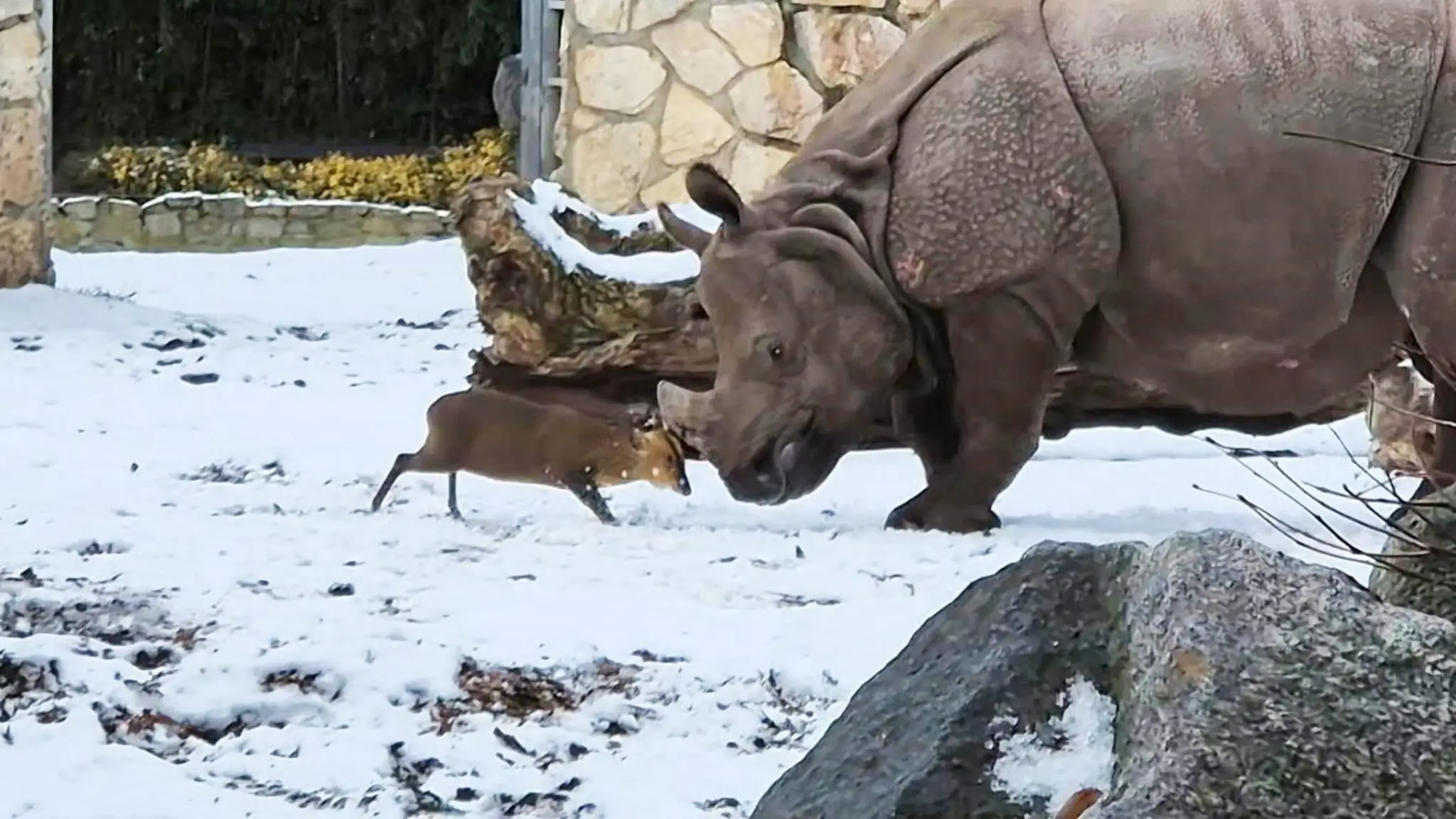 Un muntjac di Reeves, uno dei cervi più piccoli al mondo, affronta con decisione un rinoceronte: il sorprendente “scontro” allo zoo di Wroclaw non ha avuto conseguenze per gli animali