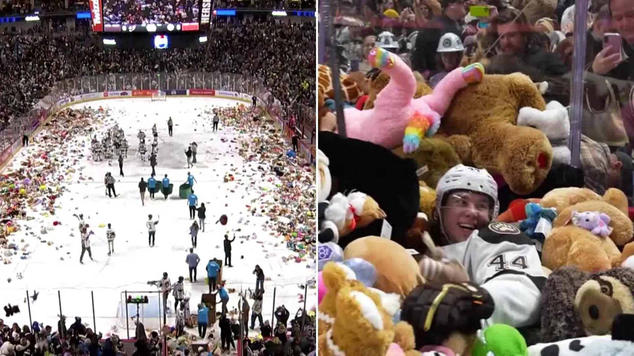Pioggia di orsacchiotti durante la partita di hockey: 80mila peluche inondano la pista