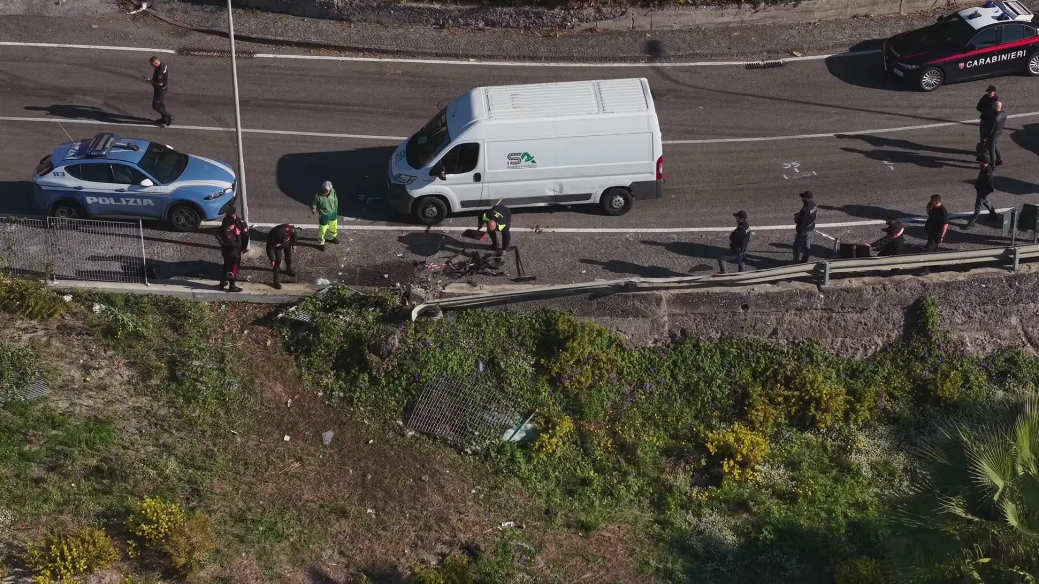 Le immagini aeree mostrano il luogo dello scontro costato la vita all'Assistente Capo Coordinatore della polizia di stato Aniello Scarpati. Sul posto poliza e carabinieri per i rilievi