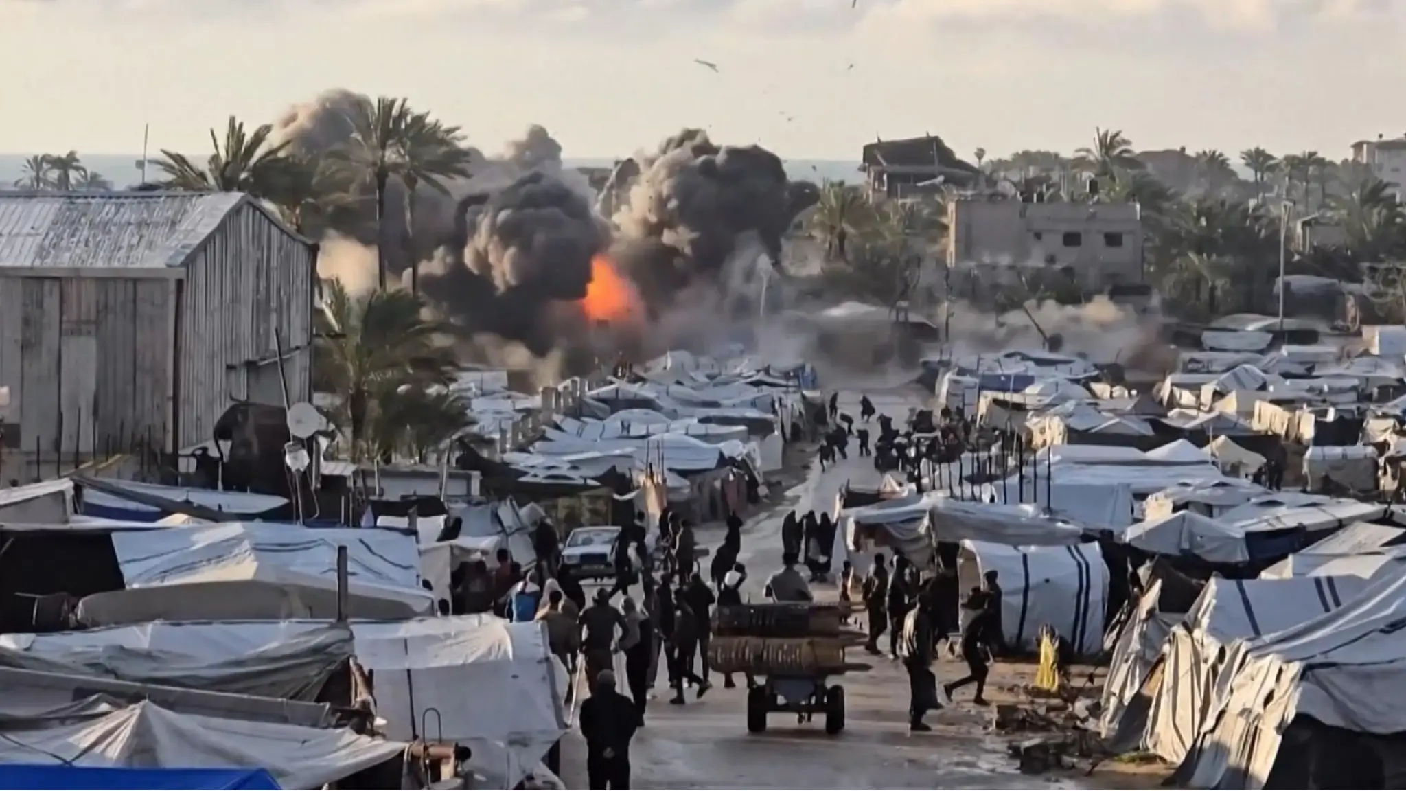 Il video mostra l’esplosione vicino alle tende degli sfollati. Almeno una persona è stata uccisa e altre sono rimaste ferite, secondo fonti mediche locali