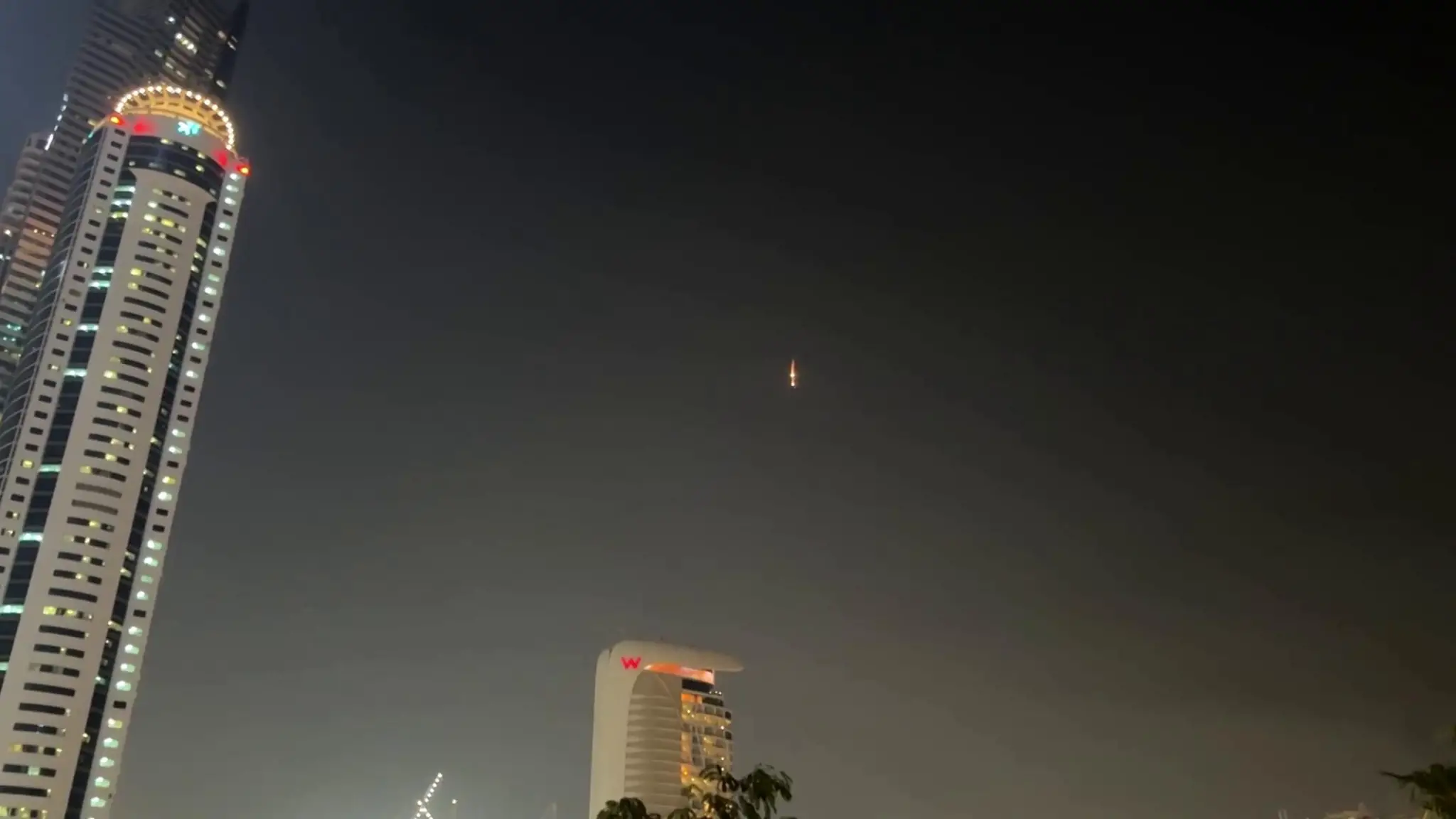 Razzi illuminano il cielo notturno di Dubai, colonne di fumo si alzano in lontananza