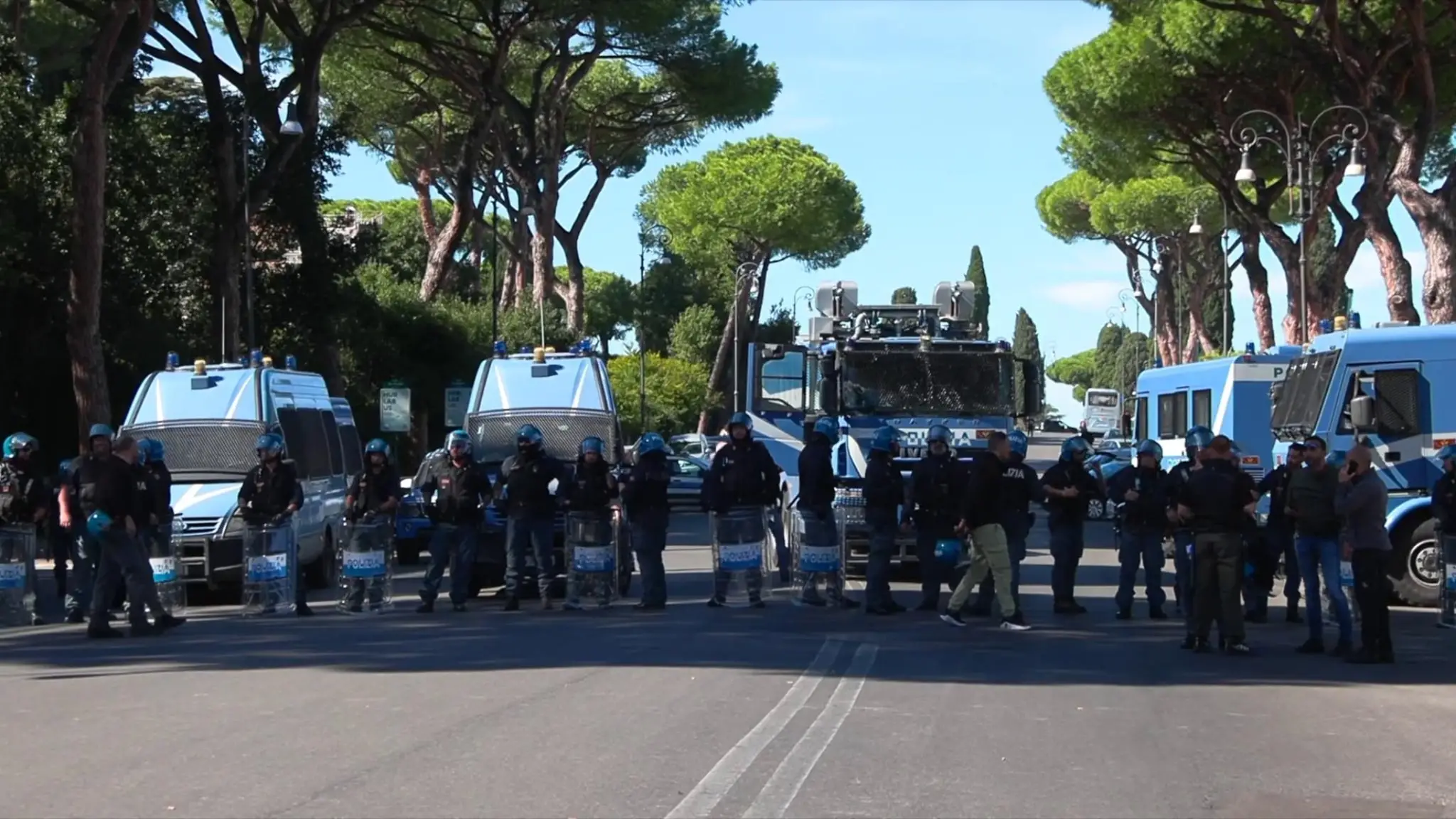 Manifestanti per Gaza si radunano vicino al Circo Massimo per un la mobilitazione nazionale. Si notano i veicoli idranti dalla polizia