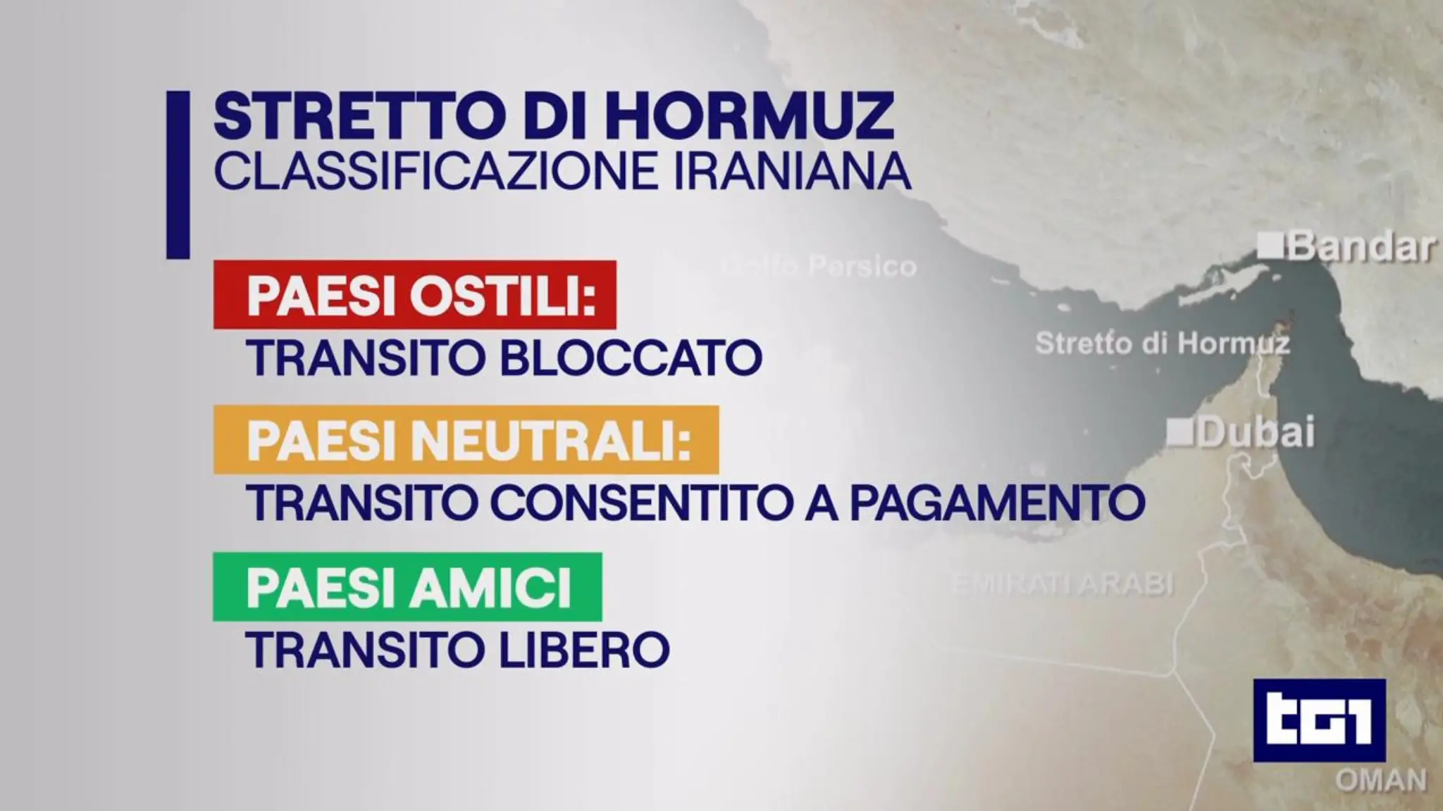 L’Iran introduce una classificazione per le navi in transito nello Stretto di Hormuz: passaggio libero per gli "amici", a pagamento per i "neutrali" (2 milioni di dollari) e blocco totale per i paesi "ostili". Obiettivo: ripagare i danni di guerra