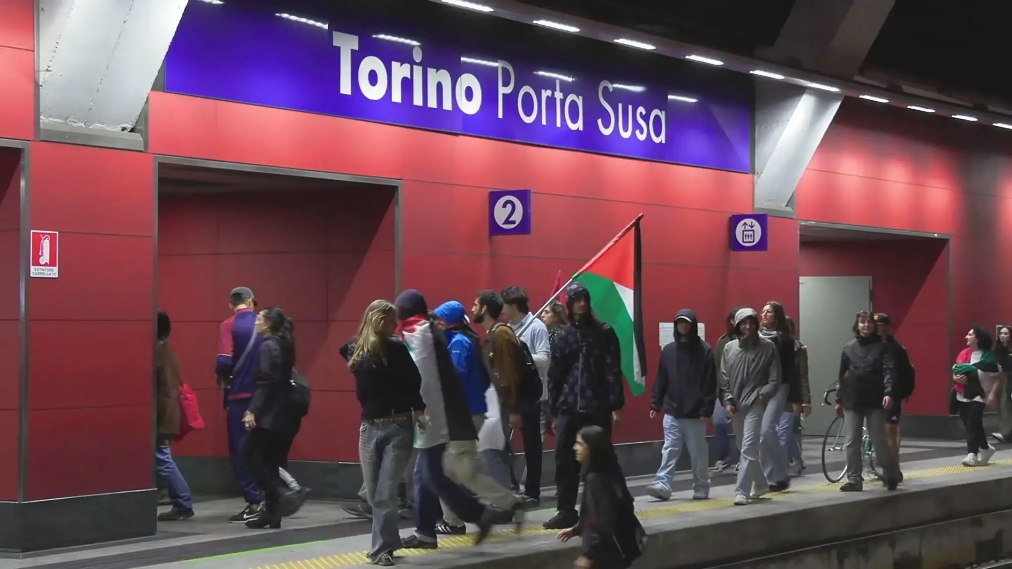 Una grande bandiera della Palestina sta blocca i binari della stazione di Porta Susa, nel centro di Torino