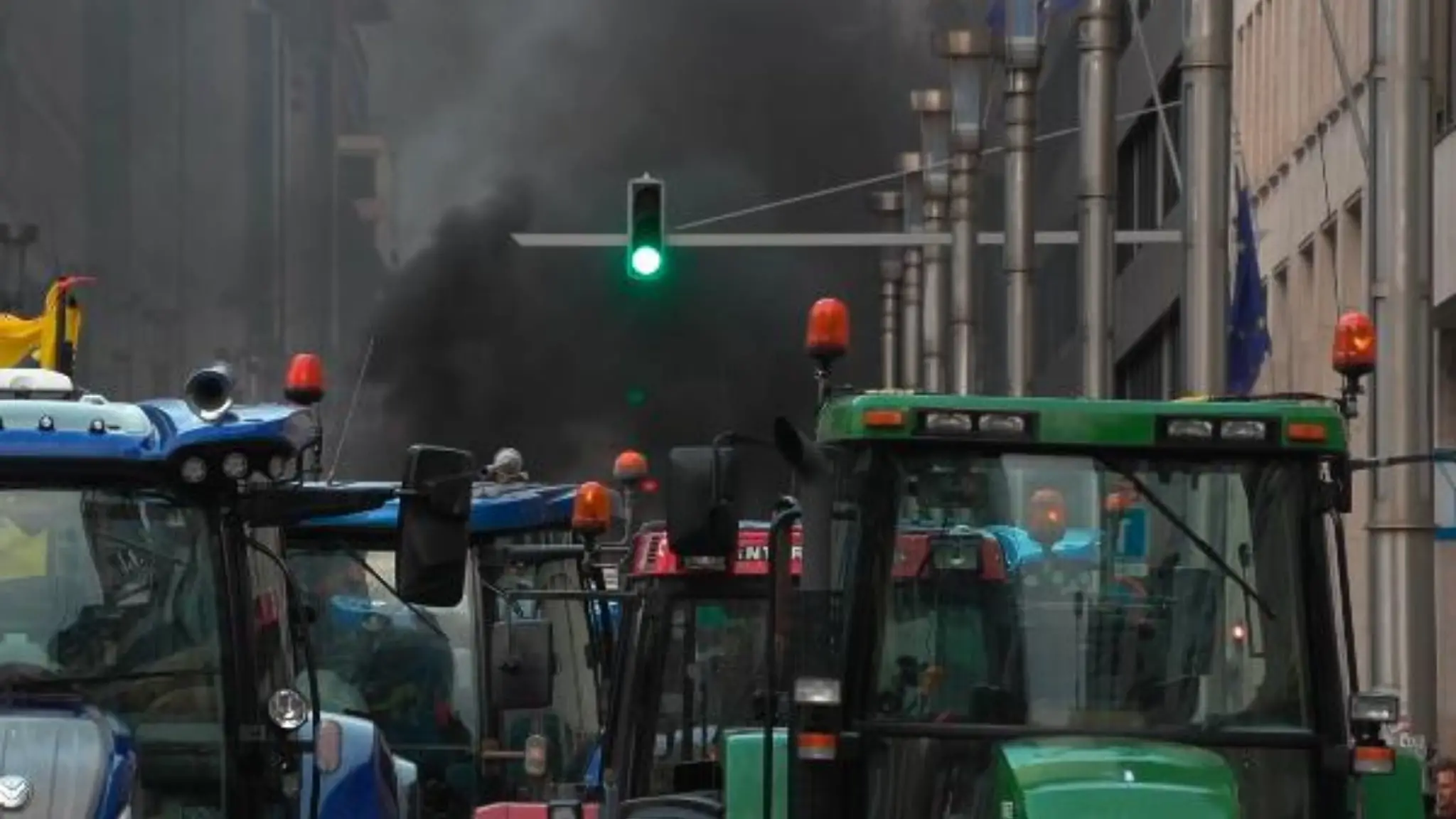 Trattori in marcia a Bruxelles, colonna di fumo si alza da un falò in strada