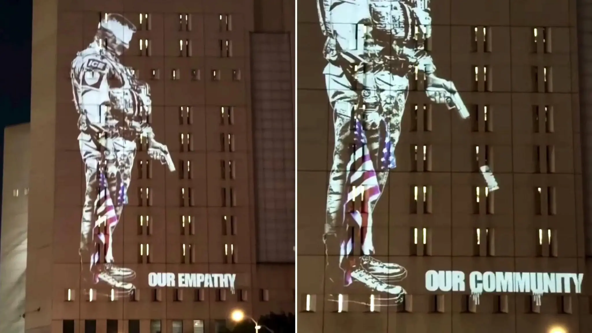 Il collettivo di artisti di strada vjaybombs ha diffuso sui social il video di una proiezione urbana all’indomani dell’uccisione di Alex Pretti a Minneapolis