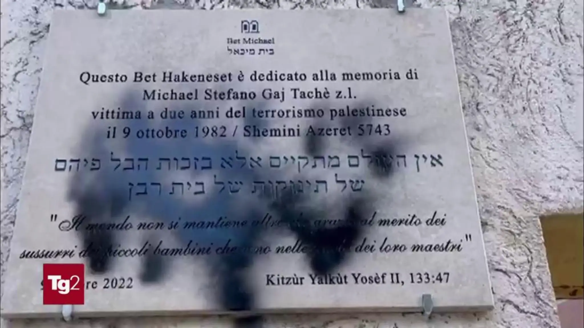 Profanata la targa di intitolazione a Stefano Michael Gaj Tachè, un bambino di due anni assassinato dal terrorismo palestinese nel 1982 in un attacco al tempio maggiore