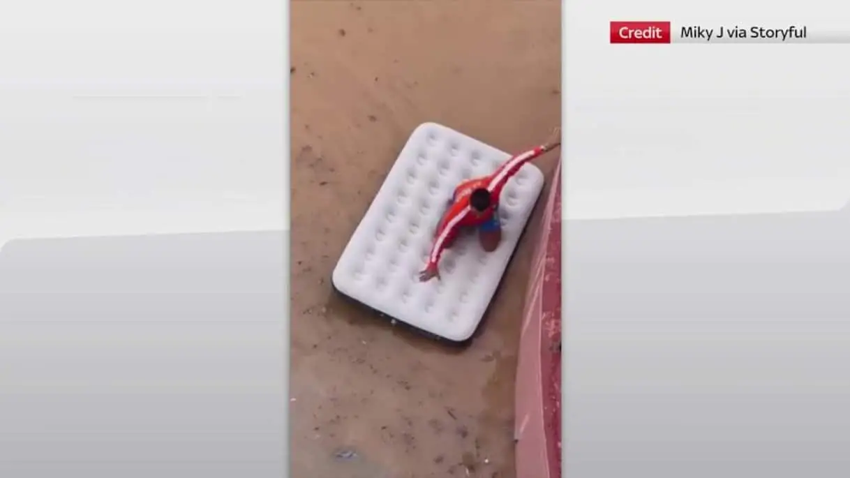 Alluvione Ibiza, uomo naviga strade allagate su materassino