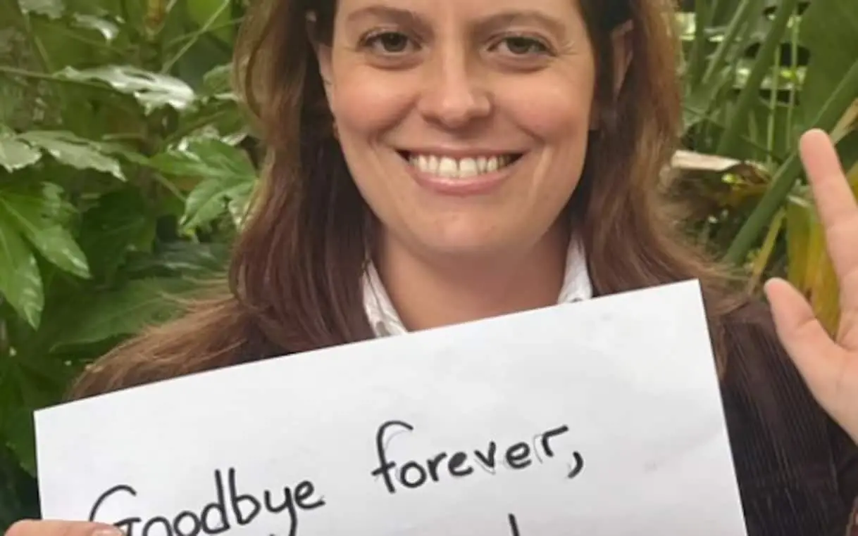 Sorride e saluta con la mano l'eurodeputata di Avs Ilaria Salis, nella foto postata su X mentre mostra il cartello con su scritto "Goodbye forever …