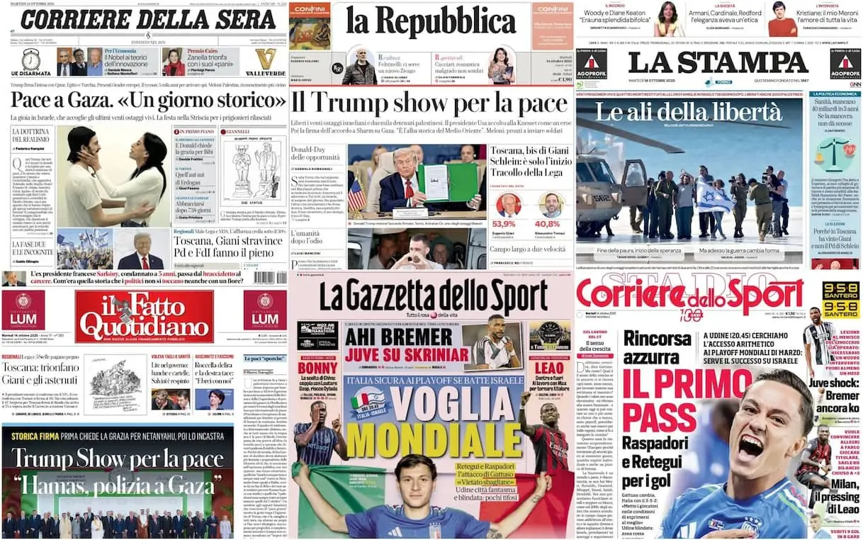 Lo storico accordo di pace per Gaza siglato a Sharm el-Sheik domina le aperture dei giornali. In evidenza le parole del presidente americano Trump, …