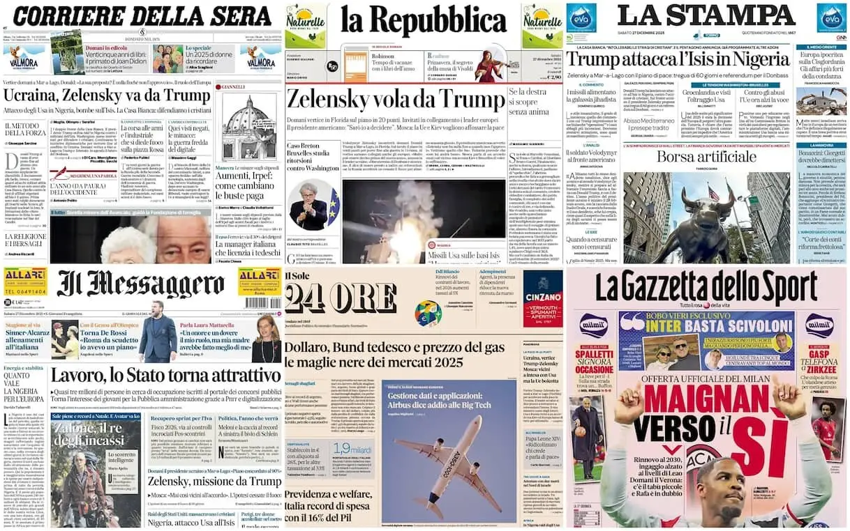 Aperture dei quotidiani con tanta politica estera. Domani, domenica 28 dicembre, è previsto l'incontro a Mar-a-Lago, in Florida, tra Zelensky e Trump …