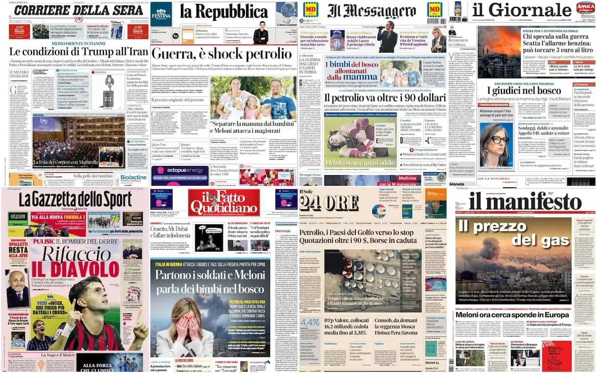 In apertura dei giornali, la guerra in Medio Oriente. Trump vuole la resa dell’Iran. Il petrolio schizza dopo l’allarme del Qatar, scatta il timore …