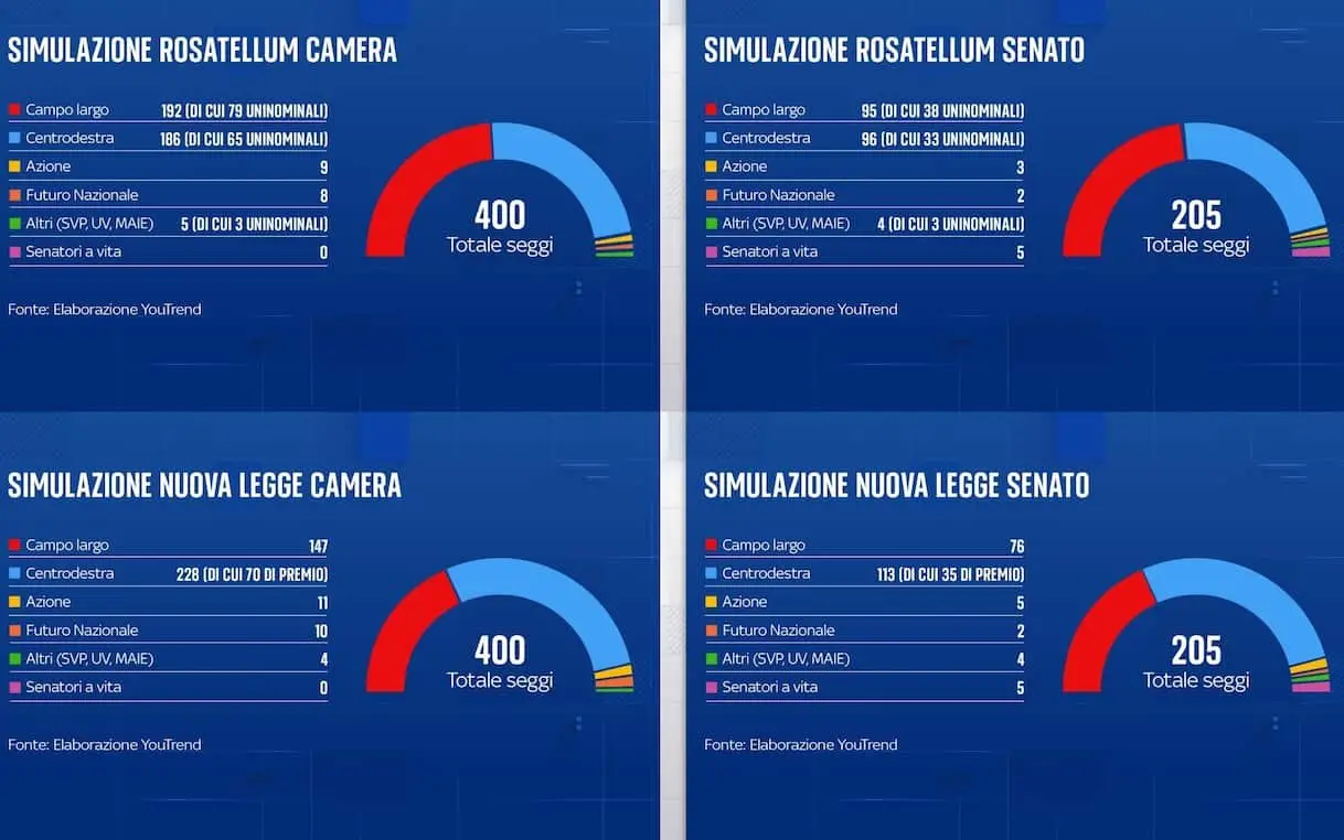 Simulazione Youtrend, con nuova legge elettorale a centrodx 57% seggi